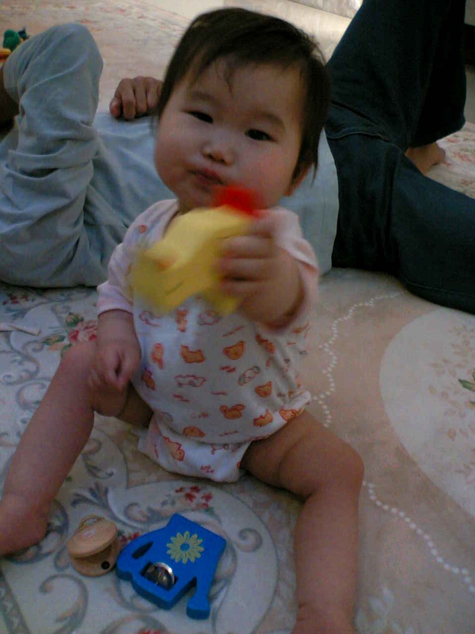 ひとしきりいじったあとは体温計のケースで床をたたいて遊んでました。
