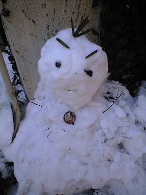 ついでに家の前の雪かきをして家の前でも雪だるまづくり。